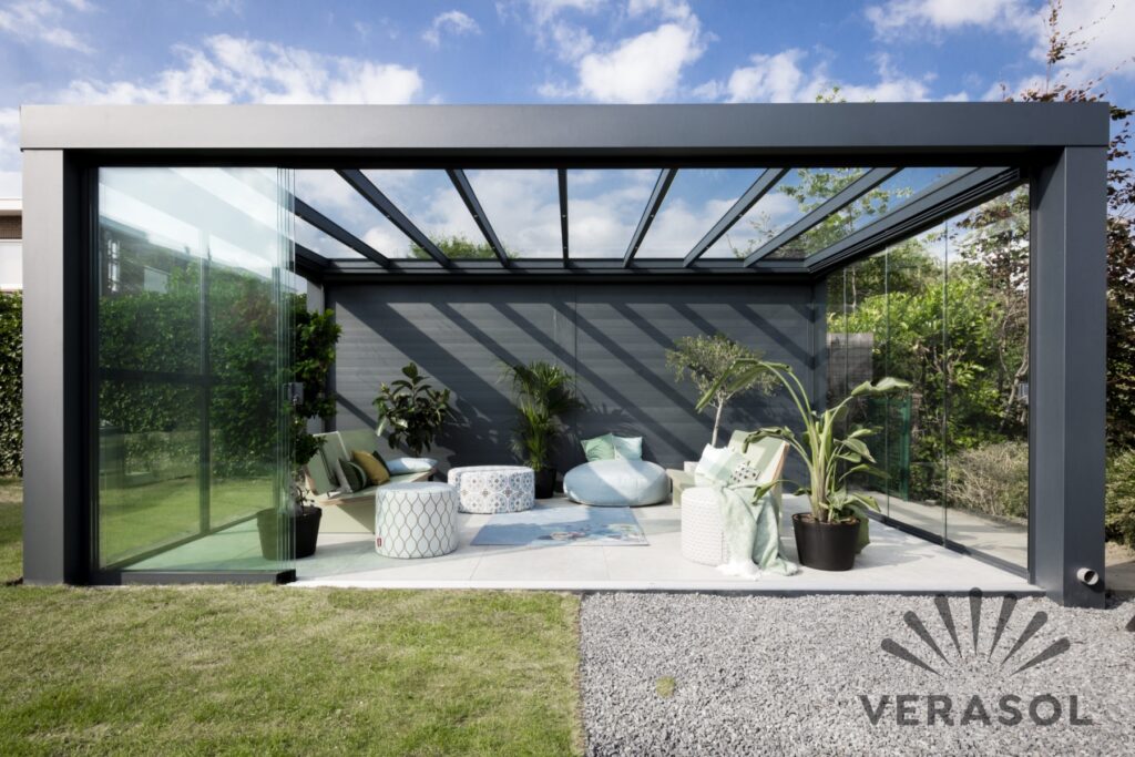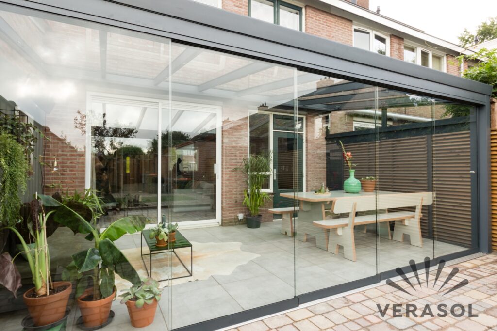 Je kunt nog wat verder gaan met je constructie van de overkapping. je kunt er namelijk ook nog voor kiezen om er een glazen schuifwand in te plaatsen. Hiermee sluit je de overkapping af voor kou en regen, maar houd je toch zicht op je tuin en op de buitenwereld.