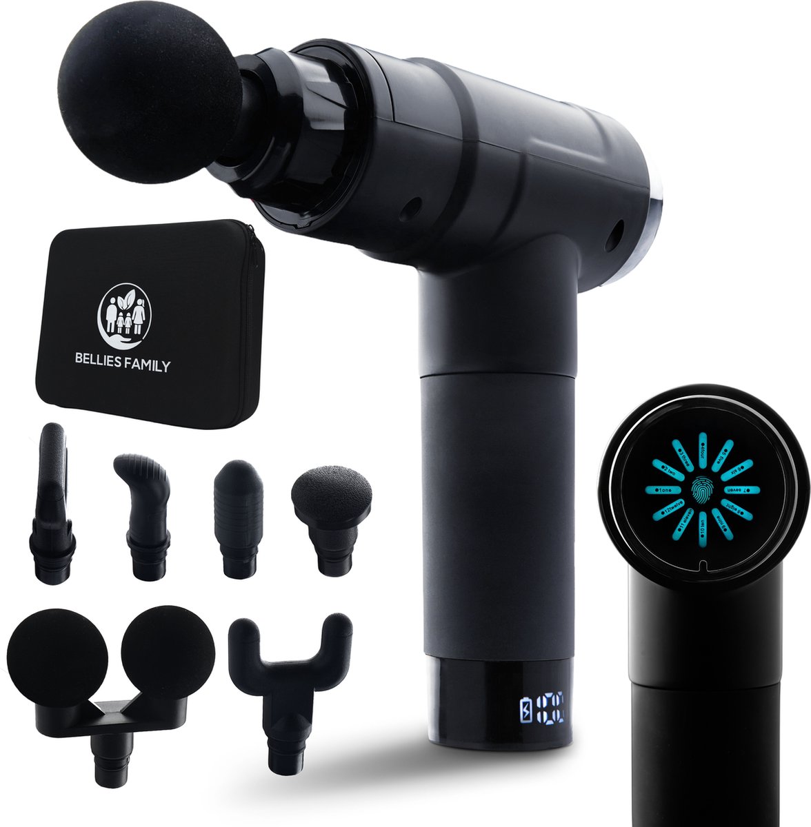 Er zijn weinig massage pistolen op het internet met zulke positieve reviews als de Massage Gun PRO van Bellies Family. Met 12 standen en 7 verschillende massage koppen heb je voldoende keuze qua intensiteit, of je nou een zachte, harde of snelle massage nodig hebt. Het apparaat is krachtig genoeg om ook de 'deep tissue' goed onder handen te nemen. Je voelt dan ook echt verschil na het gebruik van het massage gun.