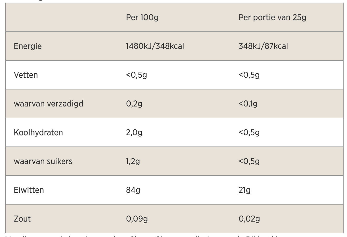 In alle eerlijkheid zijn we best onder de indruk van deze voedingswaarden. Zo geeft 1 serving je maar liefst 21 gram eiwitten en slechts 87 kcal. Verder bevat de shake amper koolhydraten en suikers en is ook het totaal aantal vetten in deze shake te verwaarlozen. Dit is dus zeker een goede eiwitshake zonder suiker.